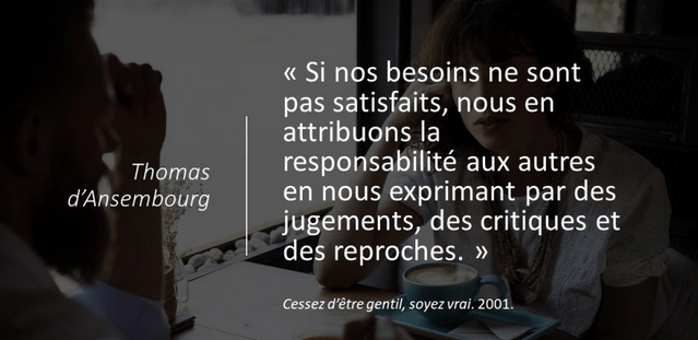 Par exemple dire: "Tu ne fais jamais attention à moi" peut être interprété comme agressif. Il serait préférable d'exprimer "Je me sens un peu délaissée en ce moment ,j'ai besoin de plus d'attention ..."