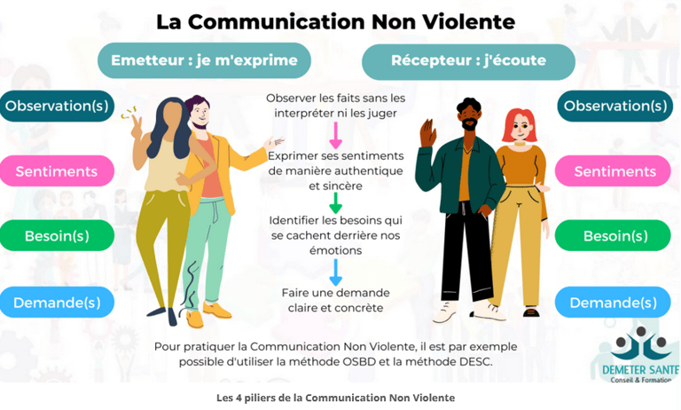 C’est une invitation à l’observation des faits sans jugement,à l’expression de ses sentiments de manière sincère,à l’identification de ses besoins et la formulation d’une demande.